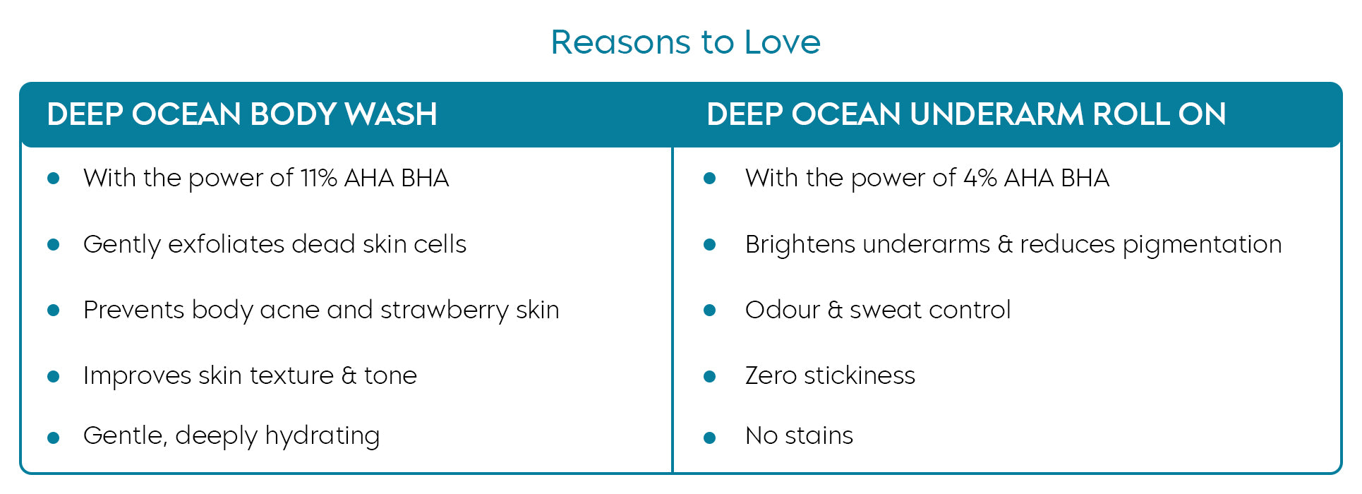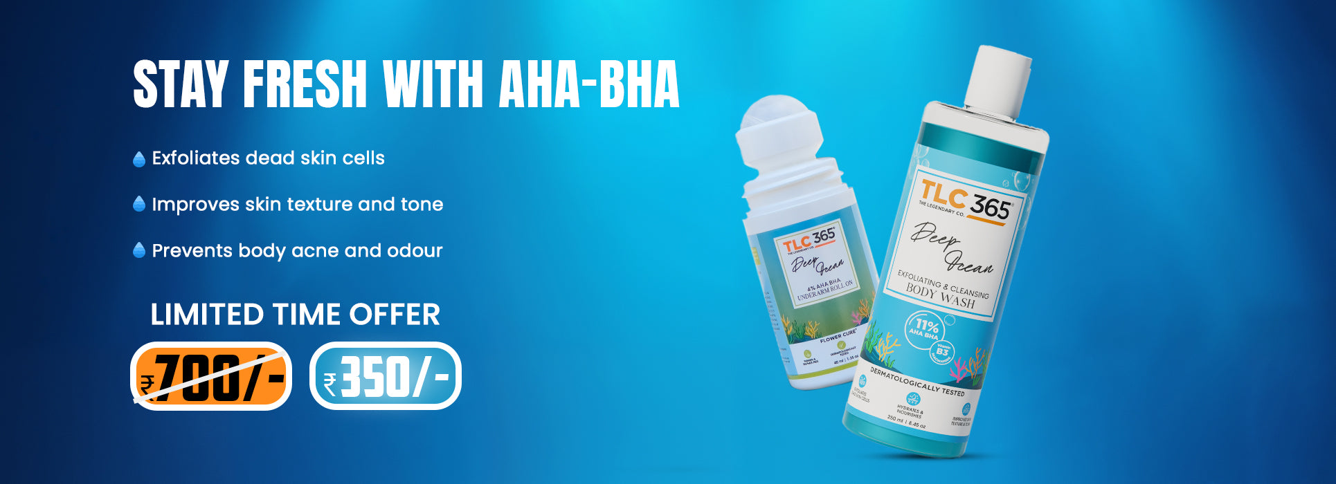 The power-packed duo with AHA BHA is your daily skincare ritual for smooth, even toned skin. Start your day with Deep Ocean Body Wash that deeply exfoliates and smoothens your skin with every shower followed by the Deep Ocean Roll On that brightens and keeps underarms fresh all day.